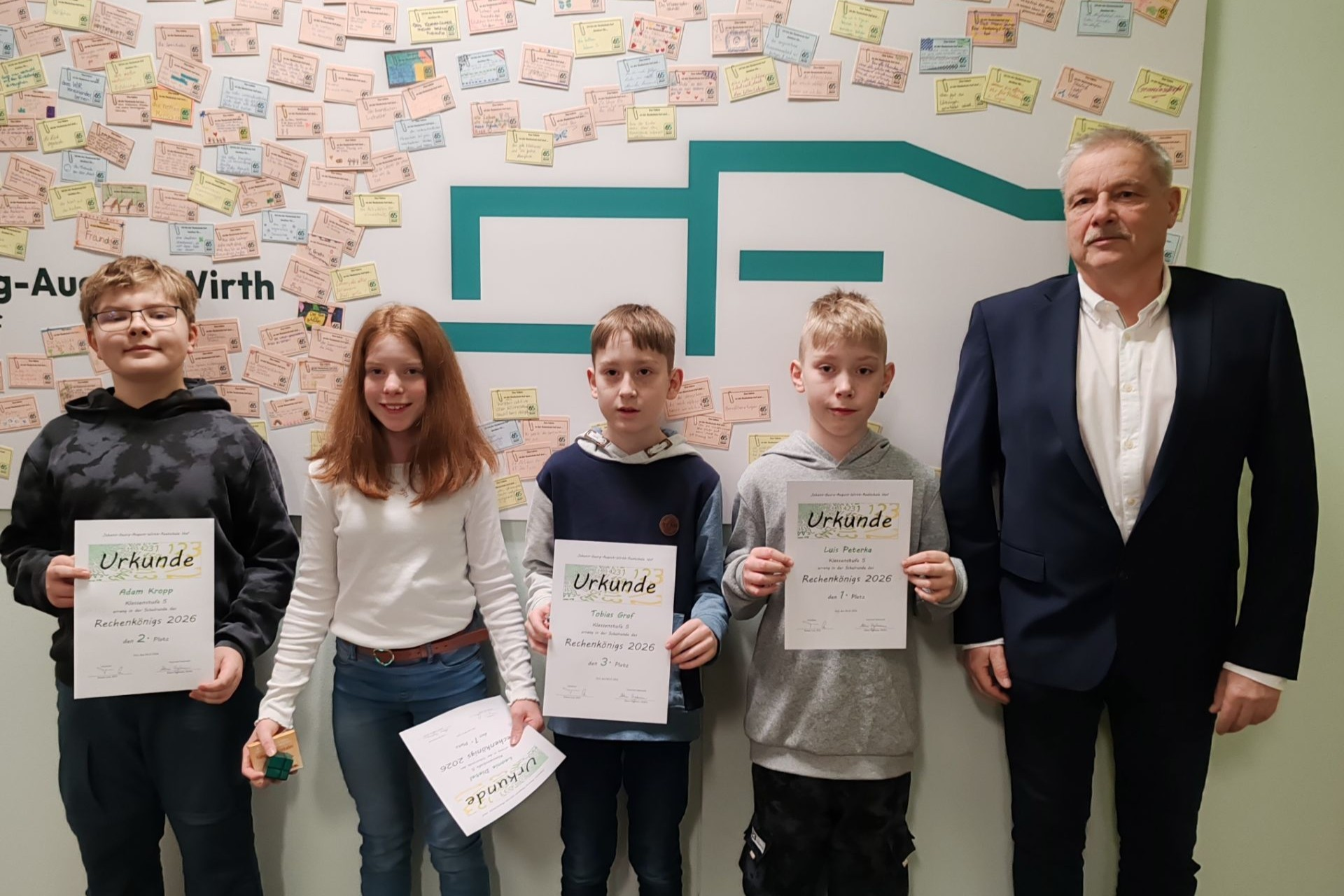 Auch in diesem Jahr hatten die Schülerinnen und Schüler der 5. Jahrgangsstufe wieder die Möglichkeit, ihr Talent im Kopfrechnen unter Beweis zu stellen. Im Rahmen eines spannenden und anspruchsvollen Wettbewerbs wurde der Rechenkönig bzw. die Rechenkönigin unserer Schule ermittelt. Die Schülerinnen und Schüler mussten dabei möglichst schnell und fehlerfrei Aufgaben aus dem Bereich der Grundrechenarten lösen. Besonders herausragend waren die Leistungen von vier Teilnehmenden, die mit bemerkenswerter Schnelligkeit und hoher Genauigkeit die vorderen Plätze belegten. Den ersten Platz und damit den Titel des Rechenkönigs bzw. der Rechenkönigin sicherten sich Leonie Dietel (5a, zweite von links) und Luis Peterka (5b, rechts im Bild). Den zweiten Platz erreichte Adam Kropp (5c, links im Bild) und den dritten Platz knapp dahinter Tobias Graf (5a, Bildmitte).