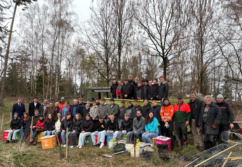 Neben dem Pflanzen der Bäume fertigten die Schülerinnen und Schüler Schutzvorrichtungen gegen Wildverbiss an und nahmen an einer „Waldchallenge“ teil, bei der sie ihr Wissen über den Lebensraum Wald vertiefen konnten. Teamarbeit, Kreativität und praktisches Lernen standen dabei im Mittelpunkt. Die Aktion unterstreicht das pädagogische Konzept der Realschule Hof: Klimaschutz wird hier nicht nur theoretisch vermittelt, sondern aktiv gelebt. Ziel ist es, junge Menschen zu verantwortungsbewusstem und nachhaltigem Handeln zu befähigen. Auch künftig soll das Projekt weitergeführt werden. Weitere Pflanzaktionen sind bereits geplant, um den Waldumbau nachhaltig voranzubringen. Vor Ort überzeugten sich zudem zahlreiche Gäste von der gelungenen Aktion: Neben der Schulleitung Torsten Lein und dem Bürgermeister der Gemeinde Döhlau Marc Ultsch waren auch Landrat Oliver Bär sowie der Landtagsabgeordnete Kristan von Waldenfels anwesend. Sie zeigten sich beeindruckt vom großen Engagement der Schülerinnen und Schüler für Klima und heimischen Wald.