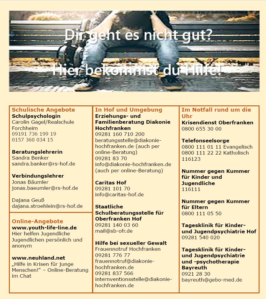 Ab Januar 2026 ist als Vertretung für Frau Dohlich die Schulpsychologin Frau BeRin (RS) Frau C. Gagel von der Realschule in Forchheim für die Realschule Hof zuständig. Als Ansprechpartnerin für Schülerinnen und Schüler sowie für Erziehungsberechtigte bietet sie Unterstützung für folgende Bereiche: