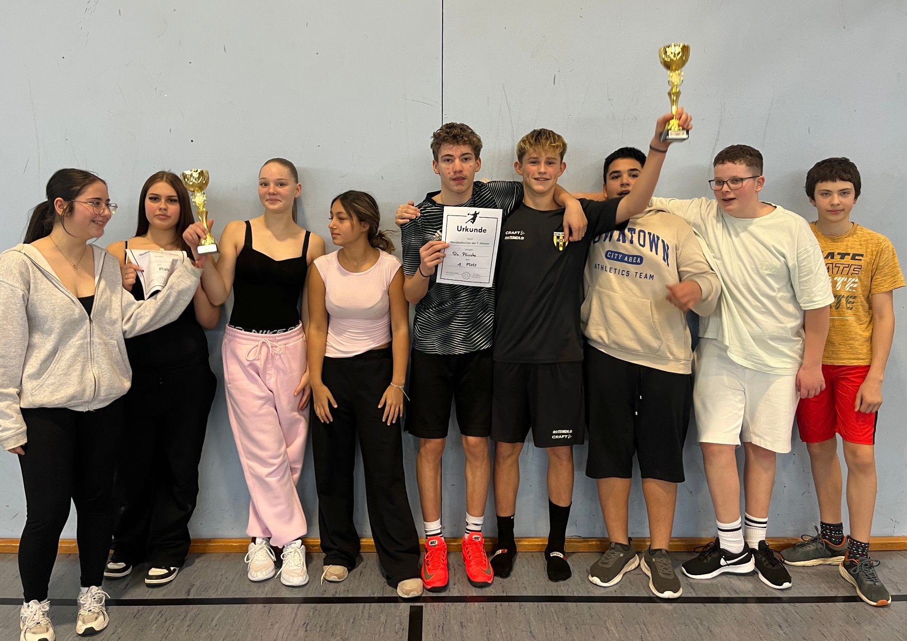Für die Schülerinnen und Schüler der 7. Jahrgangsstufe fand am 19.12.2025 ein Turnier in der Sportart Handball statt. Die Mädchen spielten eine Abwandlung des Handballs, genannt Aufsetzerball, bei der der Ball im gegnerischen Feld zuerst den Boden berühren muss, bevor ein Treffer zählt. Siegerinnen wurden die „Rizzlers“ vor „Strawberry“ und „Red Thunder“. Bei den Jungen wurde nach den offiziellen Handballregeln gespielt, wobei die Schüler selbständig die Aufgabe des Schiedsrichters übernahmen. In heiß umkämpften Spielen sicherten sich „Die Pfirsiche“ mit einer geschlossenen Mannschaftsleistung verdient den ersten Platz.