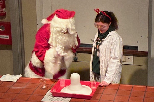 Kurz vor den Weihnachtsferien erlebten die Schülerinnen und Schüler der 9. und 10. Klassen eine ganz besondere Unterrichtsstunde. Die Referendarinnen und Referendare des Seminars unserer Schule hatten eine spannende Experimentierstunde vorbereitet – mit einem ungewöhnlichen Ziel: Ein Weihnachtsmann sollte den Wunsch der Kinder nach einer weißen Weihnacht in Hof erfüllen. Weihnachtlich verkleidet stellten sich die Referendarinnen und Referendare dieser Aufgabe und präsentierten mehrere Experimente rund um das Thema „Schnee“. Doch der Weihnachtsmann zeigte sich zunächst wenig zufrieden: Der erste Schnee brannte, der zweite war ihm zu warm. Erst beim dritten Experiment war es schließlich gelungen, einen Schnee herzustellen, der den Vorstellungen des Weihnachtsmannes entsprach. Zum Abschluss durften die Schülerinnen und Schüler selbst aktiv werden und sich vom brennenden Schnee überzeugen. Ein herzliches Dankeschön an das Seminar für diese gelungene und lehrreiche Experimentierstunde, die Wissenschaft und Weihnachtsstimmung auf eindrucksvolle Weise verbunden hat.