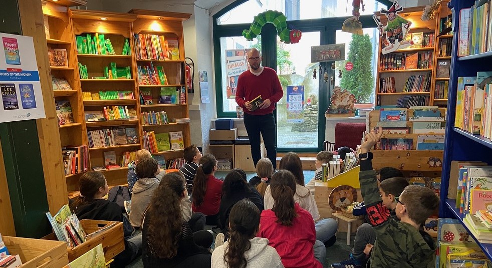 Am Dienstag, den 07.05.2024, stand für die Klasse 5D ein ganz besonderer Ausflug auf dem Plan. Anlässlich des Welttags des Buches, der am 23.04.2024 deutschlandweit gefeiert wurde, besuchten die Schüler und Schülerinnen zusammen mit den Lehrkräften Frau Propp und Frau Drescher die Buchhandlung Kleinschmidt in Hof. Nachdem uns Herr Prix in Empfang genommen hatte, folgte ein gemeinsames Gespräch über die Lesevorlieben und Lieblingsbücher der Kinder in gemütlicher Runde. Im Anschluss setzte sich die Klasse mit vielen interessanten Fragen rund um das Thema Buchhandlung auseinander: Wie viele Buchhandlungen gibt es eigentlich in Hof? Was ist der Unterschied zwischen einer Buchhandlung und einer Bücherei? Wie läuft eine Buchbestellung ab und wie setzt sich der Buchpreis zusammen?