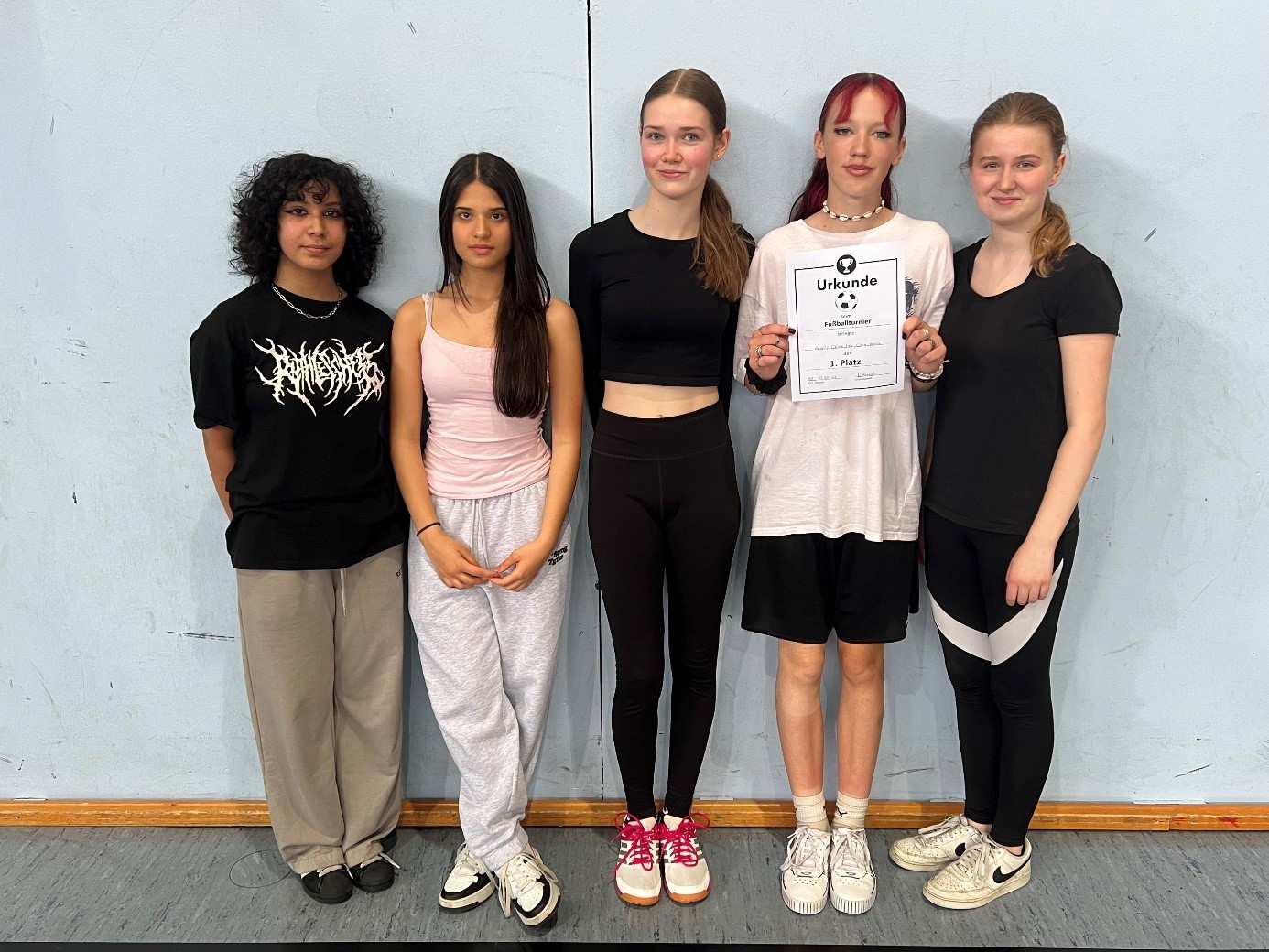 Am letzten Schultag vor den Pfingstferien, dem 17.05.2024, fand der Sporttag für die neunten Klassen statt. Es wurde Fußball gespielt. Zuerst wurden sechs Teams mit jeweils vier bis fünf Personen gebildet, die die Schülerinnen selbständig einteilen durften und es wurden Teamnamen vergeben. Dann wurden die Spielregeln und der Ablauf von unseren Sportlehrkräften erläutert. Zuerst liefen sich die Schülerinnen ein und spielten sich in kleinen Gruppen den Ball zu. Das erste Spiel startete pünktlich um 08.30 Uhr. Ein Spiel dauerte acht Minuten. Es waren spannende Spiele und alle gaben ihr Bestes. Als Siegerinnen aus dem Turnier gingen Angaly, Celine, Clara, Kalila und Lea hervor. (Bericht von: Hanna, Mila, Kim, Isabel, Lara, Anastasia)