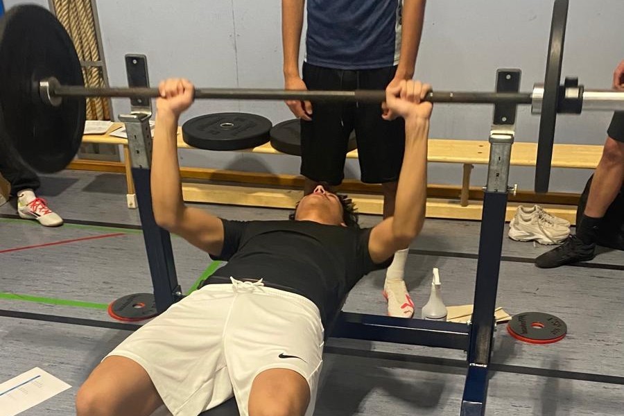 Mit einer Langhantel müssen die Schülerinnen 45 % und die Schüler 60 % ihres Körpergewichts so oft wie möglich nach oben drücken. - Pendellauf: