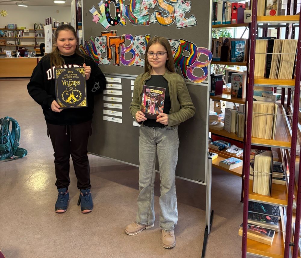Am 07.01. fand in der Stadtbibliothek Naila der Regionalentscheid im Vorlesen statt. Hier wurden wir von unseren Schulsiegerinnen Laura Schubert und Rabea Tröger vertreten, die sich dort mit zwölf weiteren Fünftklässlern aus den umliegenden Realschulen messen konnten. Auf eine erste Runde, in der bekannte Texte gelesen wurden, folgte anschließend eine zweite Runde, in der alle Teilnehmer aus dem für sie unbekannten Buch „Die magische Bibliothek der Buks“ vorlasen. Laura Schubert (im Bild rechts) und Rabea Tröger (links) konnten sich hier in einem starken Teilnehmerfeld behaupten und einen 3. bzw. 5. Platz nach Hof holen. Herzlichen Glückwunsch!
