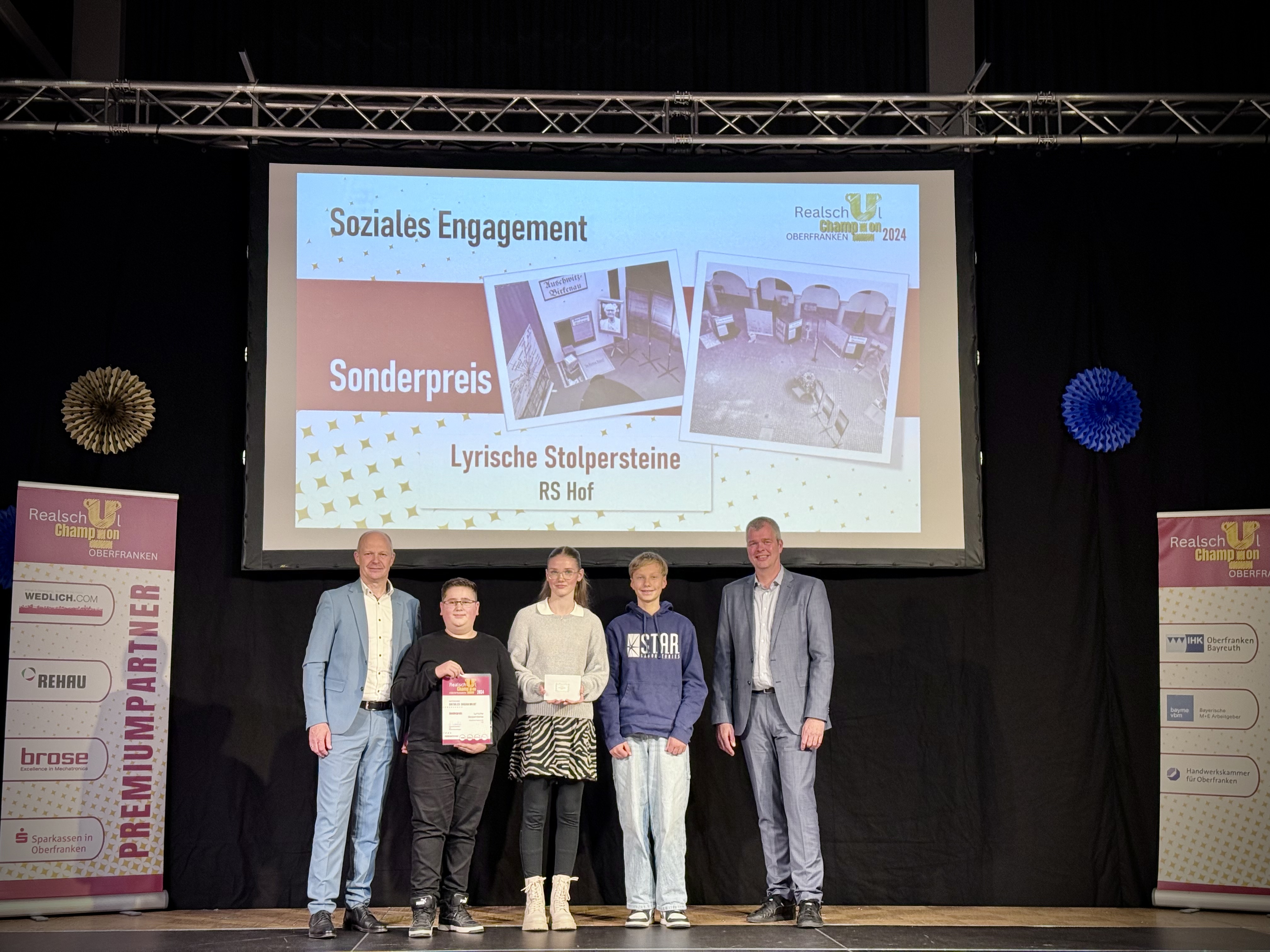 Herzlichen Glückwunsch! Drei Schülerinnen und Schüler unserer Schule nahmen stellvertretend den Sonderpreis des Realschulchampions 2024 in Coburg entgegen. Ausgezeichnet wurde die beeindruckende Ausstellung „Schaut hin“, die das Gedenken an den Holocaust in den Mittelpunkt stellt. Die Ausstellung, die in Zusammenarbeit mit engagierten Geschichtslehrern entstanden ist und von mehreren Sponsoren unterstützt wurde, setzte ein starkes Zeichen gegen Antisemitismus. Mit außergewöhnlichem Engagement haben die Schülerinnen und Schüler gezeigt, was es heißt, „hinzuschauen“: Sie haben sich intensiv mit der deutschen Vergangenheit auseinandergesetzt, Fragen gestellt, Hintergründe beleuchtet und sich auf ein schwieriges Kapitel der Geschichte eingelassen. Neben der Verleihung des Sonderpreises wurde Jessica Rost für ihre herausragenden schulischen Leistungen geehrt. Mit einem Notendurchschnitt von 1,0 in allen Fächern setzte sie ein eindrucksvolles Zeichen für Fleiß, Disziplin und Engagement. Jessica hat in allen Fächern hervorragende Leistungen erbracht und sich damit eine Auszeichnung verdient, die nur den besten Schülerinnen und Schülern Oberfrankens vorbehalten ist.