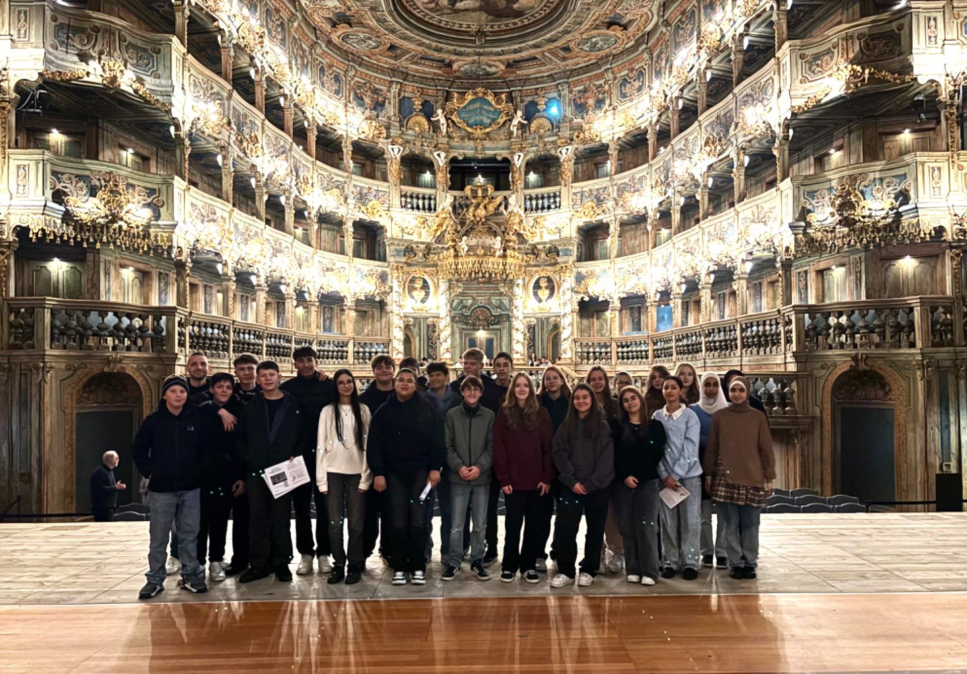 Eigentlich war es geplant, das Opernhaus nach kurzer Nutzungszeit wieder abzureißen. Zum Glück hatte Bayreuth damals kein Geld dafür, so dass das Opernhaus als heutiges UNESCO Weltkulturerbe noch erhalten ist. Unsere Schüler durften in einer Führung vieles über die Bauweise, die symbolische Ausgestaltung, die Gestaltung von Opern- und Theatertaufführungen in der Zeit des Absolutismus und die Bühnentechnik in Erfahrung bringen. Wie die originale Bühnentechnik funktioniert hat, durften sie selbst im neuen Museum auf einer kleineren Nachbildung der Theaterbühne selbst ausprobieren: Wie entstanden Wind und Regen, wie konnten Wellen gemacht werden und Schiffe auf der Bühne fahren und wie hat die Beleuchtung der Bühne funktioniert. Im Anschluss an die Führung ging es mit einem Fragebogen in kleinere Gruppen durch das Museum, in dem man viel selbst ausprobieren, anfassen oder auch riechen konnte.